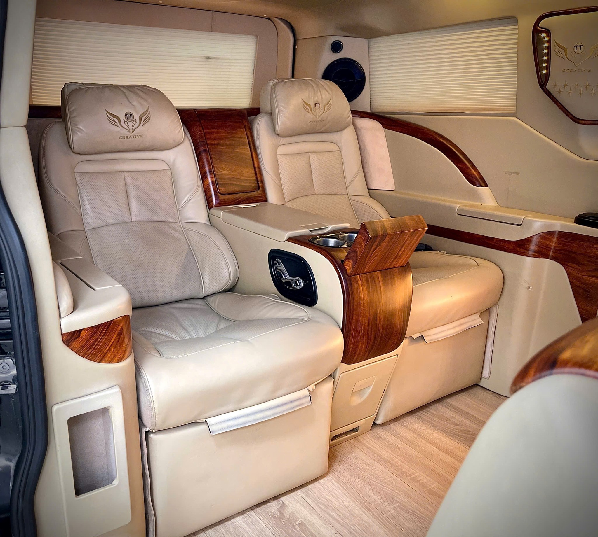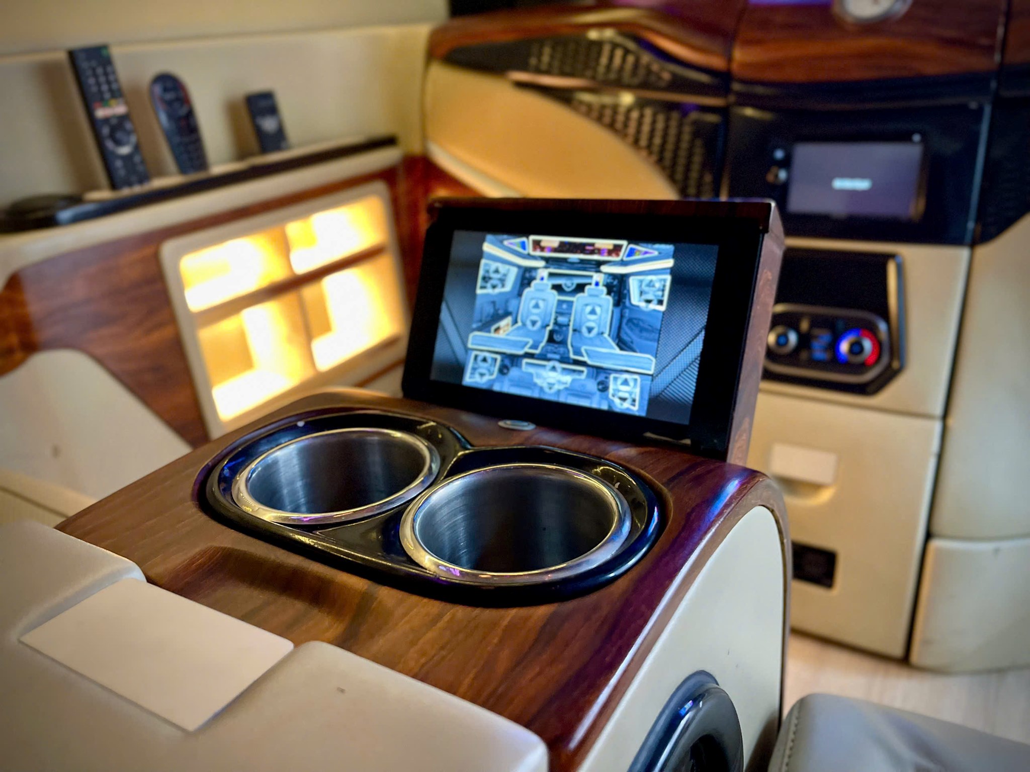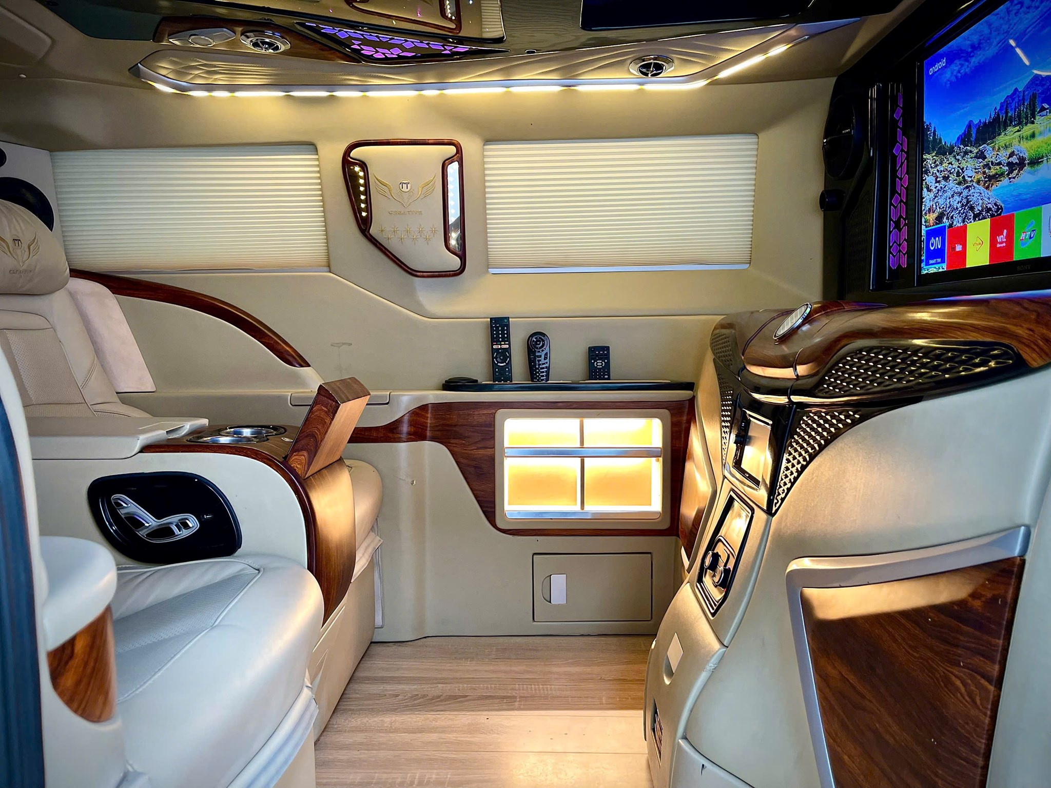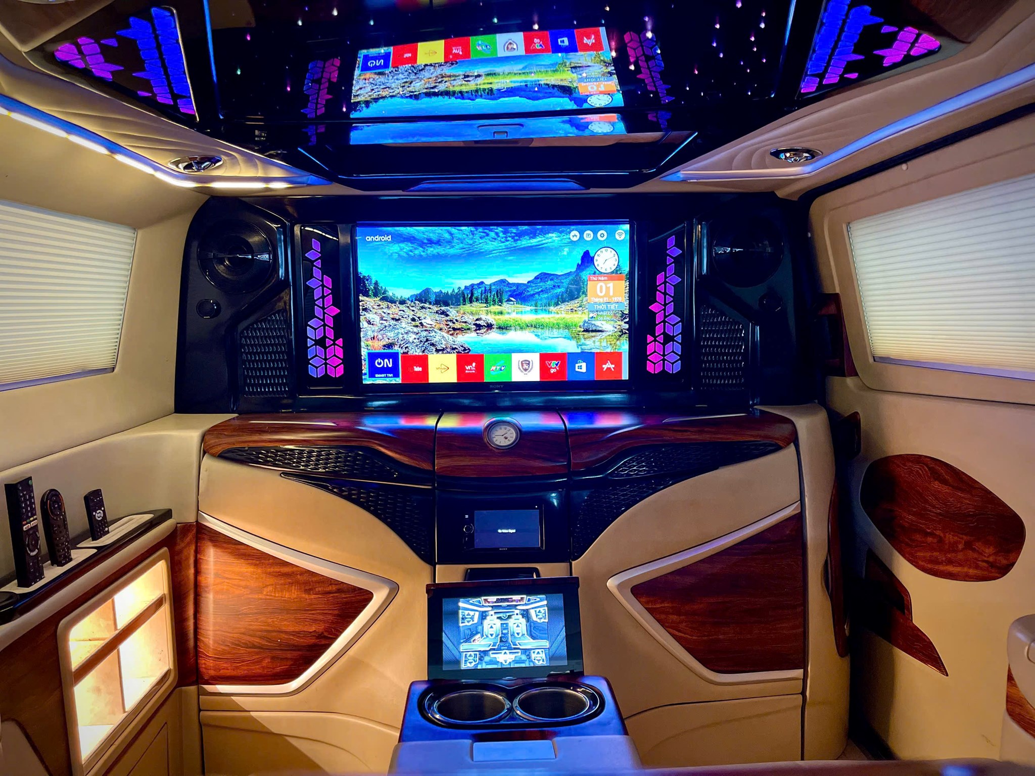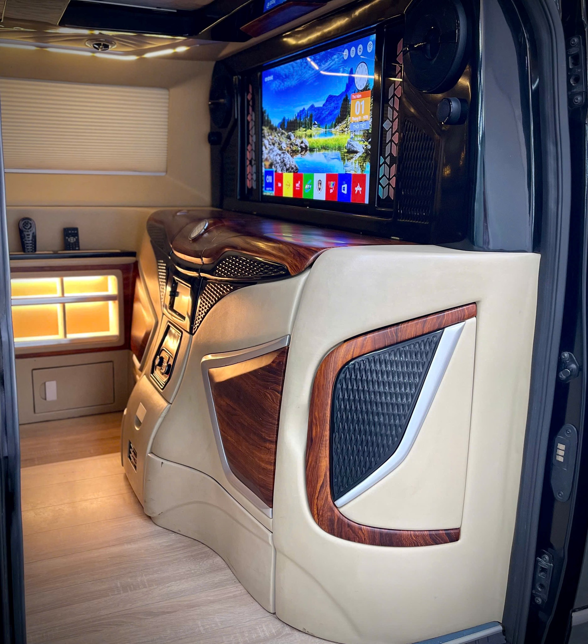 ✨ Quầy giải trí (Vách ngăn trượt, TV Sony LED 32” Android TV, Tablet, Tủ lạnh dung tích 22 lít, Hệ thống rèm điện,Ổ cắm điện 220V,…)