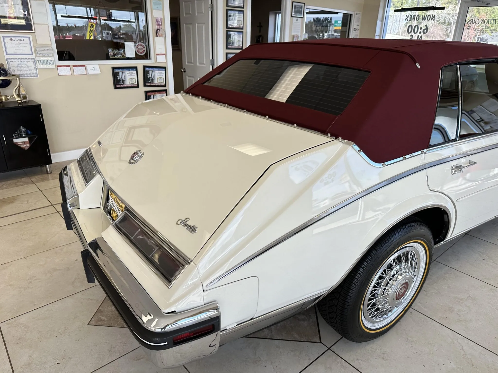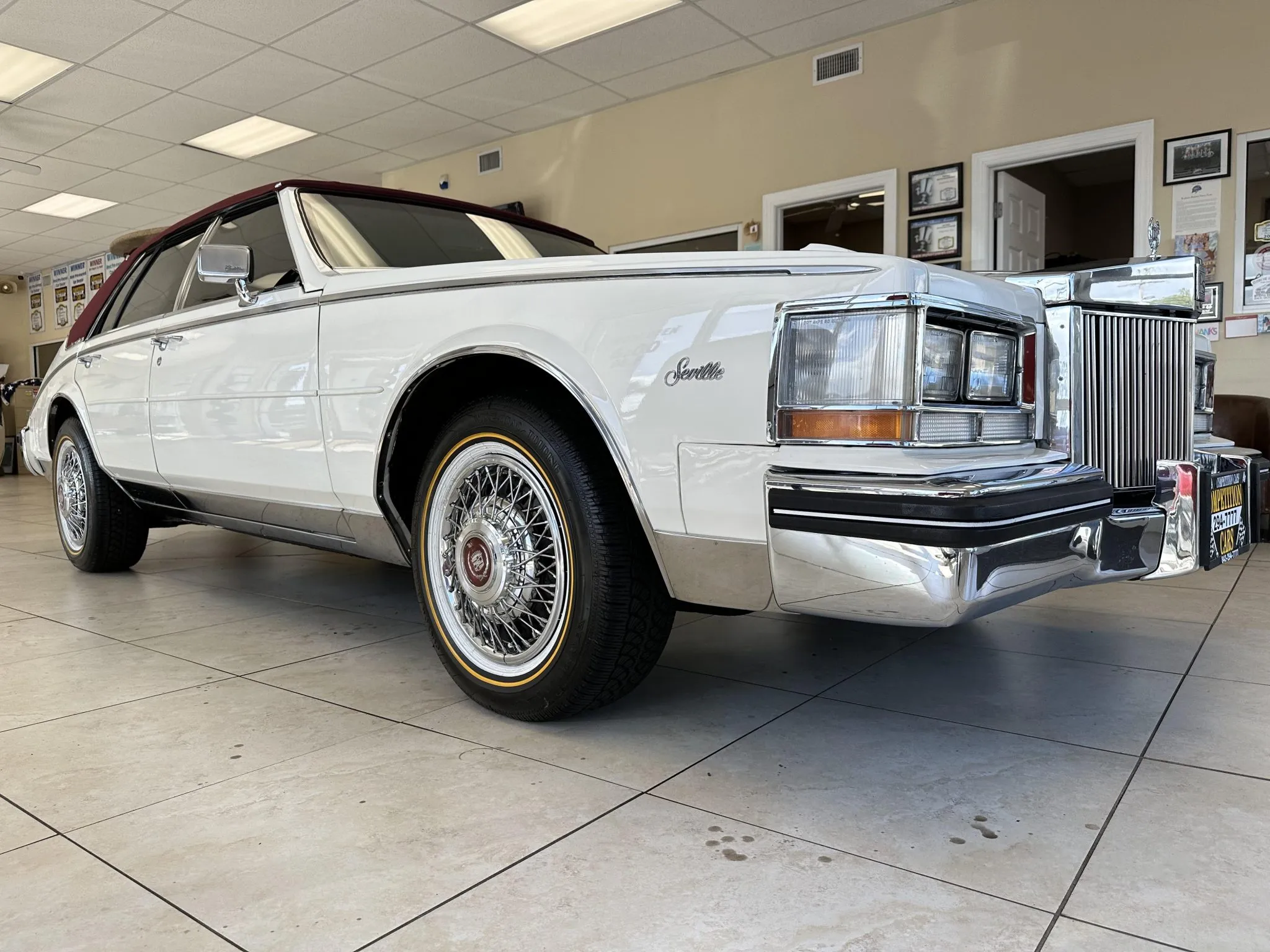 Trong dòng chảy đó, Cadillac Seville thập niên 70–80 xuất hiện như một phiên bản cô đọng. Không phải chiếc lớn nhất, nhưng là chiếc “đúng người” nhất. Nhìn vào xe là hiểu: đầu dài, thân thẳng, đuôi bustleback tách hẳn ra phía sau rồi cụp xuống. Mui vinyl đỏ mận đặt trên thân xe trắng, lốp viền trắng, chrome sáng. Tất cả không nhằm gây chú ý, mà để người ta nhận ra ngay từ xa.